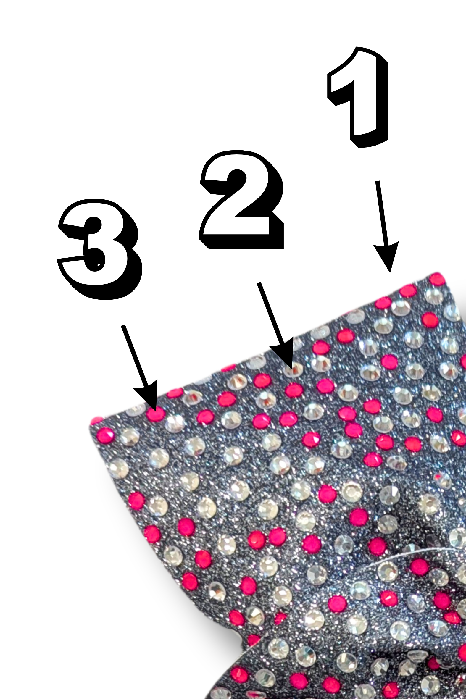 Jeżeli chcesz zamówić kokardę taką jak na zdjęciu po prawej, to w uwagach do zamówienia piszesz: "kolor 1 flamingo pink, kolor 2, czyli dżetów crystal AB, kolor 3 też crystal AB."