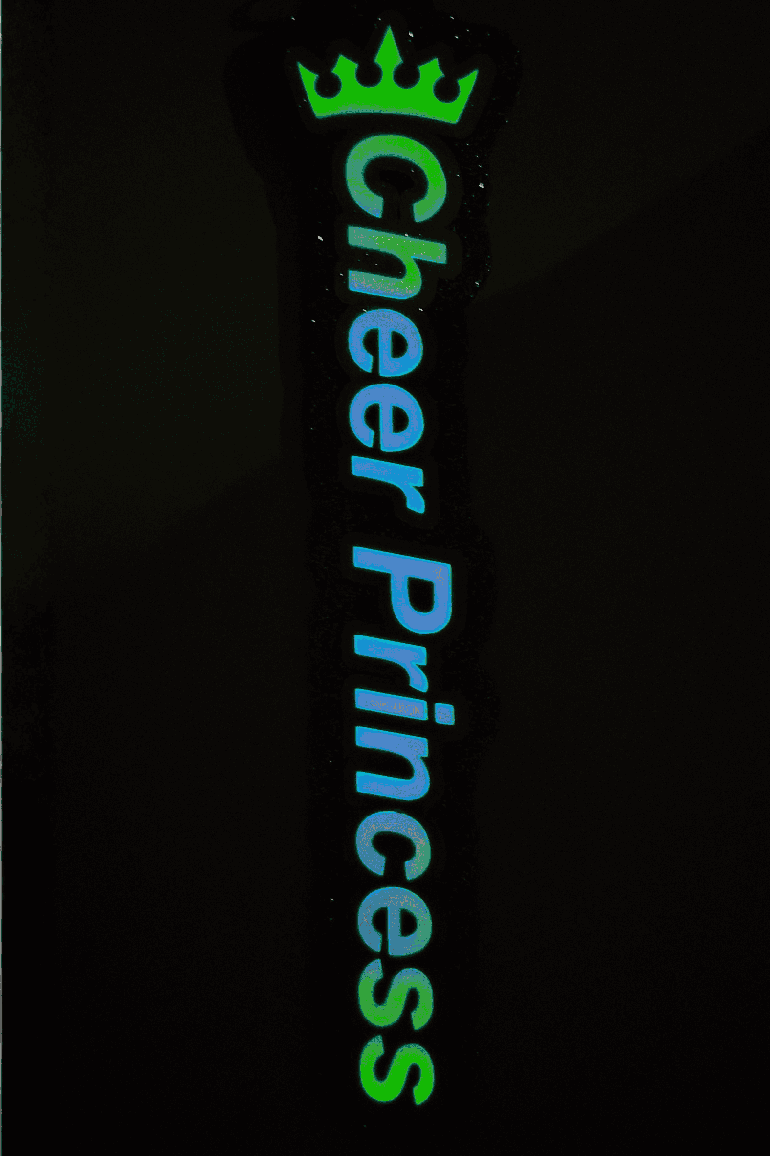 Napis breloka oraz giga korona zrobione są ze specjalnej folii świecącej w mroku, która mieni się na wiele kolorów zarówno w świetle, w cieniu, a także w ciemności. Obwódka napisu jest w kolorze białym, a tło jest jasno fioletowe, oba te kolory są w pełni brokatowe. Giga brelok Cheer Princess ma także brokatowy tył.