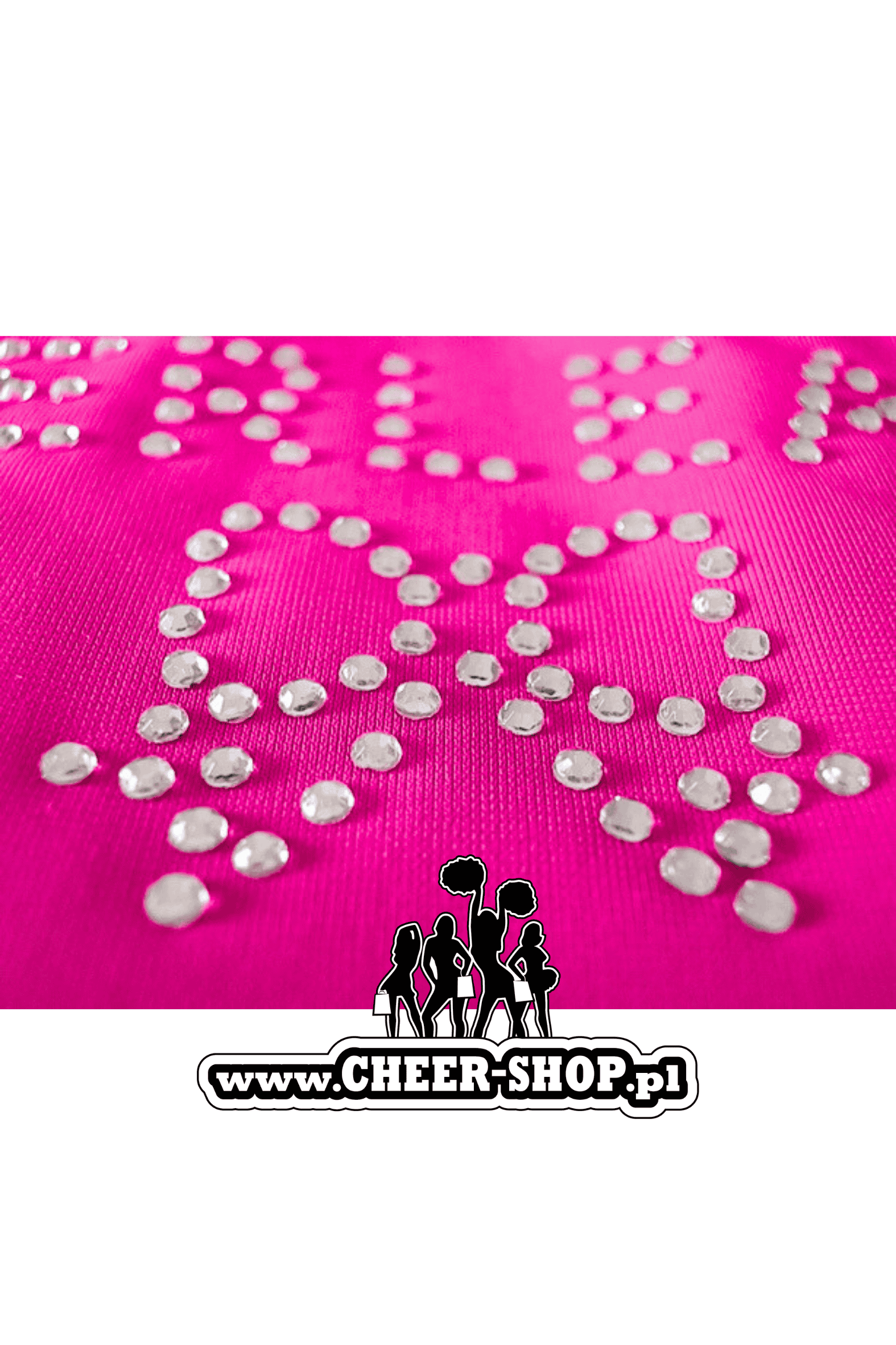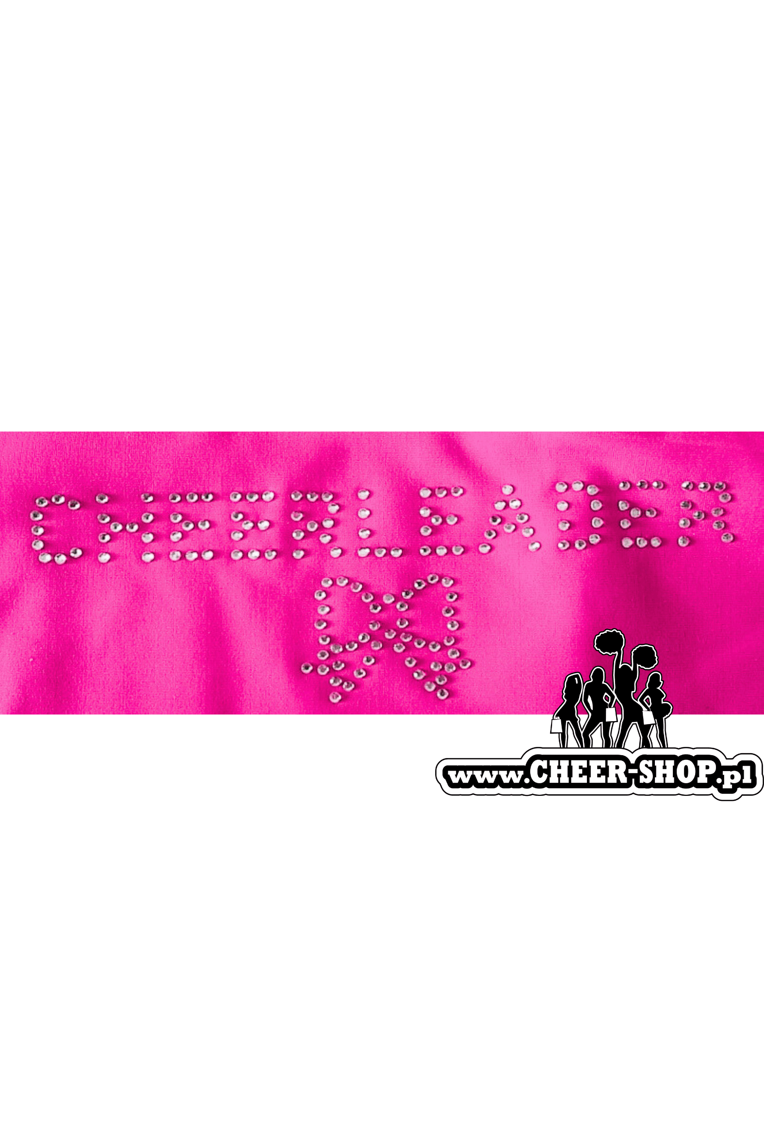 W skład kompletu wchodzi: różowa koszulka bokserka z dżetową aplikacją z napisem CHEERLEADER ozdobionym dżetową kokardką (kolor dżetów- crystal) oraz spodenki w kolorze granatowym z różowym paskiem.